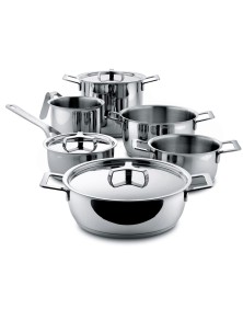 Das Pots&Pans Kochgeschirr-Set von Alessi, entworfen von Jasper Morrison, steht für funktionales, schlichtes Design. Es richtet sich an alle, die gerne mit hochwertigen Küchenutensilien arbeiten. Das Set besteht aus 7 Teilen aus Edelstahl 18/10 und verbindet Praktikabilität, Robustheit und stilvolle Schlichtheit.