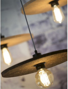 Baldachin und Schirme bestehen aus Metall mit oxidierter Oberfläche, die an alte Werkstätten erinnert und jedem Raum Charakter verleiht. Die welligen, weiß emaillierten Reflektoren im Inneren sorgen für optimale Lichtverteilung und schaffen eine warme Atmosphäre.