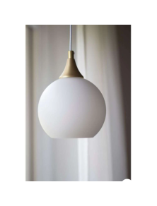 Hängelampe aus opalisiertem Weißglas mit gebürsteten Messingdetails. 120 cm weißes textilkabel mit rosette.