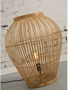 Esta hermosa lámpara de bambú tiene una silueta ligera con formas geométricas con estilo 50, la luz filtrando a través de las diferentes rayas crea una hermosa iluminación con un juego de luces y sombras. El faro está en lino, la base en bambú tejido está completamente hecha a mano en Filipinas. BUENA INFJO proporciona iluminación ecoresponsable hecha enteramente de materiales sostenibles y/o reciclados