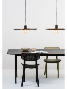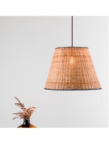 El cable revestido de tela negra añade un contraste elegante y moderno, completando la estética de esta lámpara suspendida que combina materiales naturales con una artesanía de calidad.
