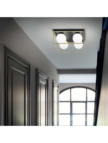 Lámpara de techo estilo decò con marco de metal pintado negro mate o base negra mate y marco de latón mate con 4 difusores de vidrio blanco, soplado y ácido.