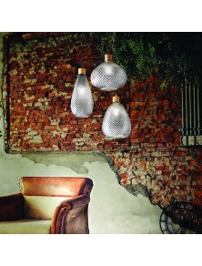 Diffuser compuesto por anillos de metal cromado o dorado con octagones de cristal incrustados dentro. Suspensiones con cables de acero ajustables en longitud desde dispositivos automáticos