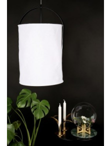 Lampe lampe suspension composé d'une fenêtre de rose, d'un cordon d'alimentation et d'une bande qui supporte un abat-jour cylindrique recouvert de lin et enrichi d'un cercle en métal noir.