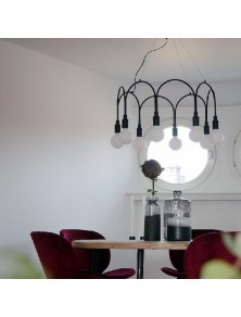 La lampe de plafond Arch a incurvé les bras en métal laqué noir, huit lumières, câble transparent et fils métalliques. Vous pouvez choisir si vous voulez les lumières vers le haut ou vers le bas, un moyen simple de changer le look à la lampe. La lampe peut être décorée avec des ampoules optionnelles. Les boulons ne sont pas inclus. La prise de plafond n'est pas incluse en raison de la nouvelle directive de l'UE. Ils peuvent être commandés séparément.