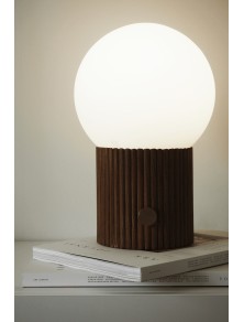 Hubble est une base en bois laqué brun ou naturel et un diffuseur en verre blanc mat.