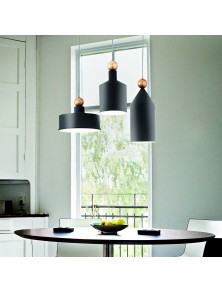 La série Kombo comprend des modèles de différentes tailles et finitions, qui partagent la même structure cylindrique en noir au sommet. L'écran est en métal, et son style minimaliste joue avec des formes géométriques. C'est l'option de lampe suspension avec fiche et câble de 5 mètres. Le crochet est inclus.