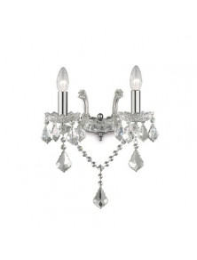 The Dubai AP2 wall lamp by Ideal Lux represents a refined balance between classic elegance and decorative sophistication. Its metal frame, available in polished chrome or warm brass finish, enhances the sparkle of the clear cut crystal elements. Decorative pearls, octagons, and prisms capture and reflect the light, creating charming luminous effects that enrich any interior.