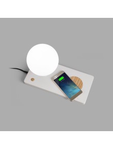 Hubble is a brown or natural lacquered wood base and matt white glass diffuser.