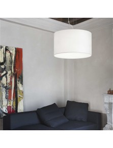 The matt-painted metal shade, available in black or white with a white interior, provides a soft, uniform light diffusion, ideal for creating warm and functional atmospheres. The powder-coated metal canopy and the fabric-covered cable add a refined, artisanal detail to its minimalist design.