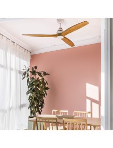 Ventilatore da soffitto bianco con motore DC con luce, ideale per stanze fino a 17,6m2. Funziona con telecomando, incluso. Ha 5 velocità regolabili con un consumo di 4-9-16-23-35W e 86-108-130-145-175 rivoluzioni per minuto secondo velocità. Questo ventilatore ha funzione inversa estate-inverno ed è adatto per soffitti inclinati.