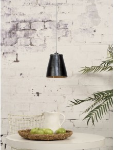 Uno stile bohémien per questa lampada Bhutan che mescola sapientemente materia naturale e design contemporaneo, in uno spirito etnico chic contemporaneo. Il paralume a doppia parete è realizzato a mano in Vietnam con canne di bambù bicolore intrecciate, naturale e nero. Ogni pezzo è una vera sfida tecnica la cui produzione richiede un'eccezionale maestria. L'altezza è regolata tramite cavo. GOOD&MOJO fornisce un'illuminazione eco-responsabile realizzata interamente con materiali sostenibili e/o riciclati