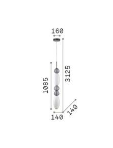 La struttura, in metallo cromato, assicura un’estetica lucida e contemporanea, mentre le sfere in vetro sospese creano un gioco di riflessi elegante e sofisticato. Il diffusore, realizzato in vetro soffiato trasparente o fumé, conferisce profondità e brillantezza all’insieme. L’altezza può variare da un minimo di circa 45 cm fino a un massimo di circa 220 cm, per adattarsi perfettamente all’ambiente.