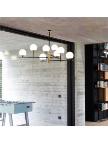 Il rosone e la montatura in metallo verniciato opaco donano robustezza e un carattere deciso, mentre i diffusori in vetro incamiciato bianco, soffiato e acidato, diffondono una luce morbida e avvolgente. Grazie alle dimensioni importanti, con un diametro di oltre un metro, questa sospensione diventa un elemento centrale in qualsiasi ambiente, conferendo eleganza e luminosità.