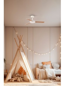 MINI MALLORCA DC S è un ventilatore da soffitto con motore a corrente continua in stile classico, ideale per stanze di dimensioni inferiori a 13 m². Il motore è in acciaio bianco e le pale sono in compensato. Le pale sono rifinite in acero bianco e reversibili. Si aziona tramite telecomando, incluso. Ha 6 velocità regolabili, grazie alla funzione inversa è possibile cambiare il senso di rotazione delle pale del ventilatore e quindi utilizzarlo sia in estate che in inverno. In estate, contribuendo ad ottenere un ambiente fresco e in inverno migliorando l'efficienza del sistema di riscaldamento al far circolare l'aria calda che si accumula vicino al soffitto. Adatto per soffitti inclinati, dato che permette all'asta di cadere verticalmente in modo che il ventilatore rimanga sempre parallelo rispetto al soffitto, assicurandone così il miglior funzionamento e comfort.