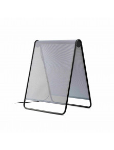 La struttura ricorda quella di un triangolo. Emette un fascio di luce calda che viene proiettato giusto a metà dei due schermi. È fabbricata in alluminio e in textilene, un materiale di alta qualità, che resiste perfettamente ai cambi di temperatura e che viene utilizzato anche per fabbricare i lettini da spiaggia. Comprende un accessorio per fissare la lampada al suolo e uno come estensione per il cavetto.