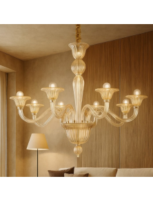 Het metalen frame met gouden afwerking straalt luxe en prestige uit en creëert een spel van reflecties dat elk detail van de structuur benadrukt. De transparante geblazen glazen armen maken de compositie lichter en geven de lamp een luchtige en harmonieuze uitstraling, terwijl ze toch een belangrijke decoratieve aanwezigheid behouden.