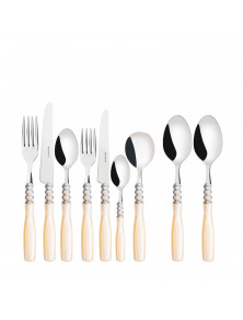 De Arianna Ghiera Cromata-lijn van gekleurd bestek bestaat uit de gevlochten ringmoer in glanzende chroomkleur, geïnspireerd op de beroemde draad van Ariadne waaraan het zijn naam ontleent, en het elegante ivoorkleurige handvat van parelmoer acryl met verschillende korrels. leent zich uitstekend voor het maken van uw bijzondere en verfijnde mise-en-place. De bijzondere ergonomie van het handvat en de perfecte balans van het bestek garanderen een prettige ervaring en gebruiksgemak. Gemaakt van 18/10 roestvrij staal.
