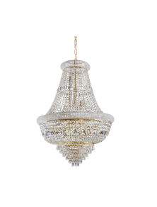 Het metalen frame garandeert stevigheid en duurzaamheid, terwijl de fluwelen kettinghoes een detail van elegantie toevoegt dat het ontwerp compleet maakt. Met plaats voor twaalf E14-lampen (niet inbegrepen) biedt de BRIGITTA SP12 ruime en gelijkmatige verlichting, ideaal voor grote woonkamers, eetkamers, ontvangstzalen of commerciële interieurs die vragen om een kroonluchter met een sterk visueel effect. Dankzij de royale afmetingen en ambachtelijke afwerking is dit model de perfecte keuze voor wie functionaliteit, traditie en eigentijdse stijl wil combineren.
