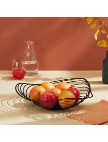 Gemaakt van roestvrij staal 18/10, is de schaal verkrijgbaar in twee afwerkingen: gepolijst staal en zwart met een epoxyharscoating. De opengewerkte structuur benadrukt de presentatie van het fruit en bevordert de ventilatie.