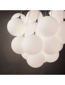 Het metalen frame, verkrijgbaar in chroom of mat wit gelakt, biedt afhankelijk van de keuze een opvallende of juist subtiele uitstraling. De mondgeblazen glazen diffusers, leverbaar in wit of gerookt, zorgen voor een warme en sfeervolle verlichting met een zachte, egale lichtspreiding die de ruimte op elegante wijze benadrukt.