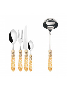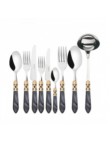 Geïnspireerd door een hedendaagse visie op tijdloze schoonheid, combineert de Aladdin-lijn verfijnde esthetiek met praktische prestaties. Dankzij de ruime keuze aan kleuren en decoraties past dit bestek perfect bij elke tafeldecoratie. De met de hand bewerkte acryl handgrepen en de antiekzilver gevlochten ring maken elk stuk uniek. Perfecte balans, ergonomie en scherpe messen zorgen voor optimaal gebruikscomfort en precisie.