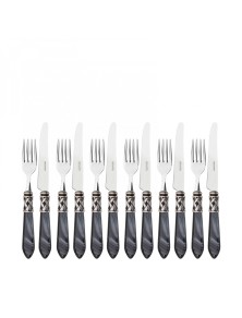Cada detalhe dos talheres Aladdin combina estética e praticidade: o aço inoxidável 18/10 garante durabilidade e brilho, enquanto o cabo em acrílico, trabalhado à mão, apresenta veios e reflexos únicos. O anel entrançado em prata envelhecida acrescenta um toque de requinte e distinção.