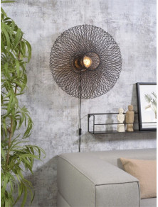 Estilo boêmio para a coleção de lâmpadas Java com uma silhueta leve. O candelabro de bambu é feito à mão no Vietnã. A lâmpada tem uma grande leveza visual graças ao seu candeeiro perfurado que projeta sombras delicadas. A estrutura é feita de madeira natural ou preto lacado. a lâmpada pode ser colocada livremente na parede graças ao cabo, o interruptor ON / OFF está localizado na base da parede. GOOD&MOJO fornece iluminação eco-responsável feita inteiramente de materiais sustentáveis e/ou reciclados