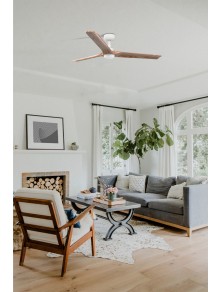 Inclui um comando de rádio frequência para ajustar as seis velocidades disponíveis e ativar o modo verão/inverno, que inverte a rotação das pás para uma melhor circulação do ar durante todo o ano. Pode ser instalado em tetos planos e, com haste opcional, também em tetos inclinados até 28°.