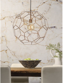 Lâmpada de metal com acabamento de cobre formado por elementos hexagonais com uma lâmpada visível dentro