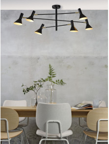 Isto é óptimo lâmpada de teto completamente articulado permite orientar a luz com precisão: os três braços são ajustáveis e os seis lampshades são ajustáveis. O lâmpada de teto estilo de metal preto ou areia vintage inspirado pelas lâmpadas dos anos 50. A forma cônica dos lampshades dar a esta lâmpada um olhar sofisticado e intemporal, digno dos maiores ícones de design.