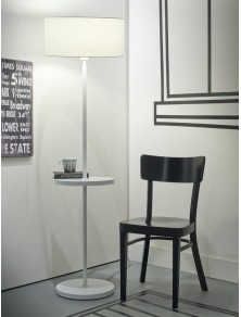 Lâmpada de metal lacado branco com prateleira circular para livros ou pequenos objetos e lampshades têxteis, interruptor ON/OFF