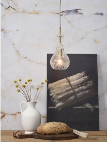 Lâmpada lampada pendurada retrò em vidro cinzelado com motivos em relevo transparente com detalhes de ouro, sua forma é inspirada pelas carafanas de um tempo. Adapta todos os estilos de mobiliário, clássico e moderno