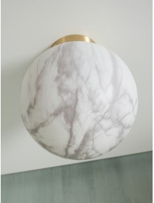 Lâmpada de teto luxuosa e elegante com sua estrutura dourada e o candeeiro de bola de efeito de mármore branco Carrara, do qual toma seu nome.