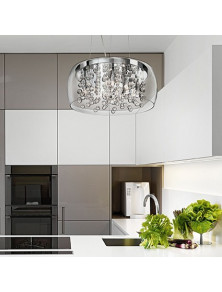 Moldura de metal cromado. Elementos decorativos em cristal de pérola. Suspensões com cabos de aço ajustável em comprimento de grampos de cabo automático.