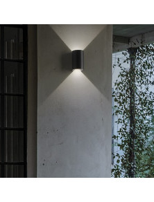 Candeeiro de parede com corpo de luz em alumínio fundido com pintura eletrostática. Estrutura interna que reflete o feixe de luz acima e abaixo. Disponível em acabamentos antracite, branco, preto, cinza e marrom