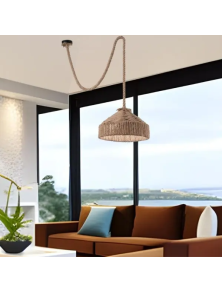 A estrutura em metal pintado combina-se com os cabos elétricos e difusores revestidos em corda de cânhamo natural, conferindo à peça um caráter orgânico e artesanal. A textura do cânhamo proporciona um toque rústico, perfeito para interiores de estilo nórdico, industrial ou boho.
