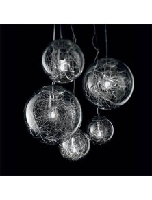 Quadro cromado. Difusor de vidro soprado com decoração interna em fio de alumínio. Suspensões com cabo de aço ajustável em comprimento do dispositivo automático da parada do cabo.